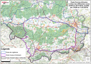 Afgelopen zondag hebben jagers bij de bestrijding van de everzwijnen in de versterkte observatiezone twee exemplaren geschoten die na analyse besmet bleken te zijn met de Afrikaanse varkenspest. Dit gebeurde in de bossen gelegen tussen Meix-devant-Virton en Sommethonne (ten zuiden in de provincie Luxemburg).