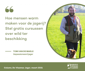 ‘Hoe de interesse in jacht laten toenemen? Stel gratis cursussen over wild beschikbaar.’ Dat schrijft Tom Van de Maele, gepassioneerd jager en gewezen medewerker van FACE, in een wisselcolumn in De Vlaamse Jager van maart 2021.