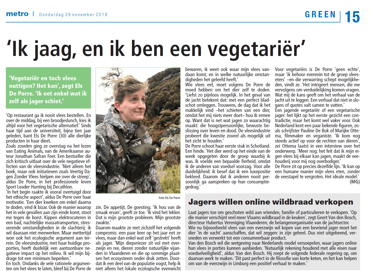 ‘Vegetariër en toch vlees nuttigen? Het kan’, zegt Els De Porre in het gratis dagblad Metro. ‘Ik eet enkel wat ik zelf als jager schiet.’