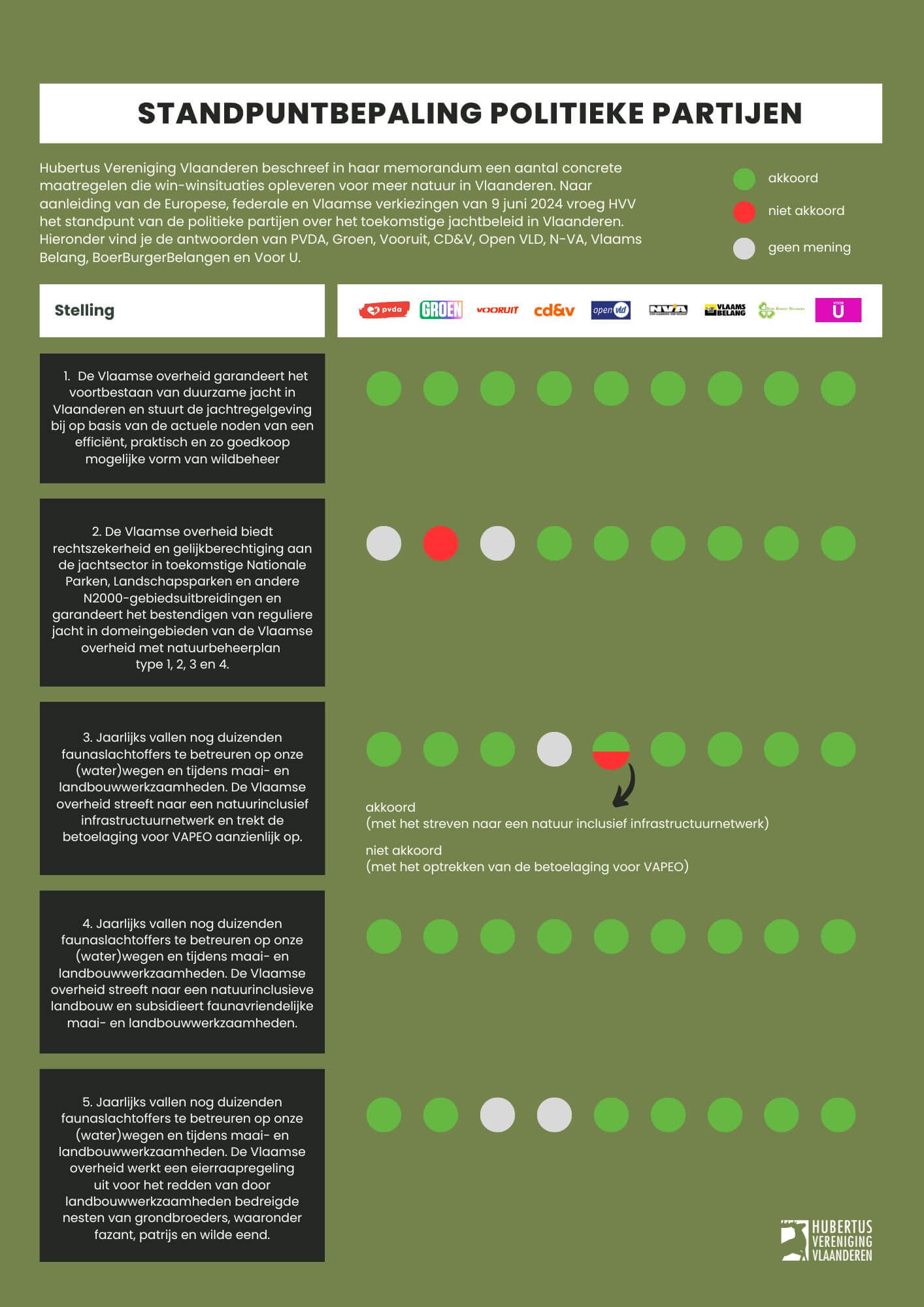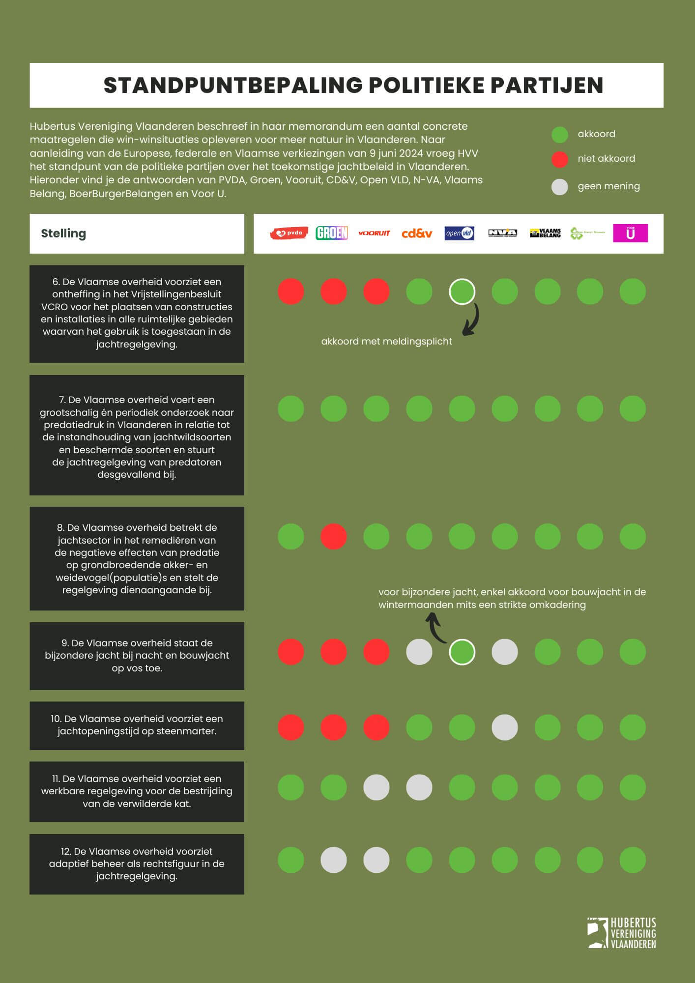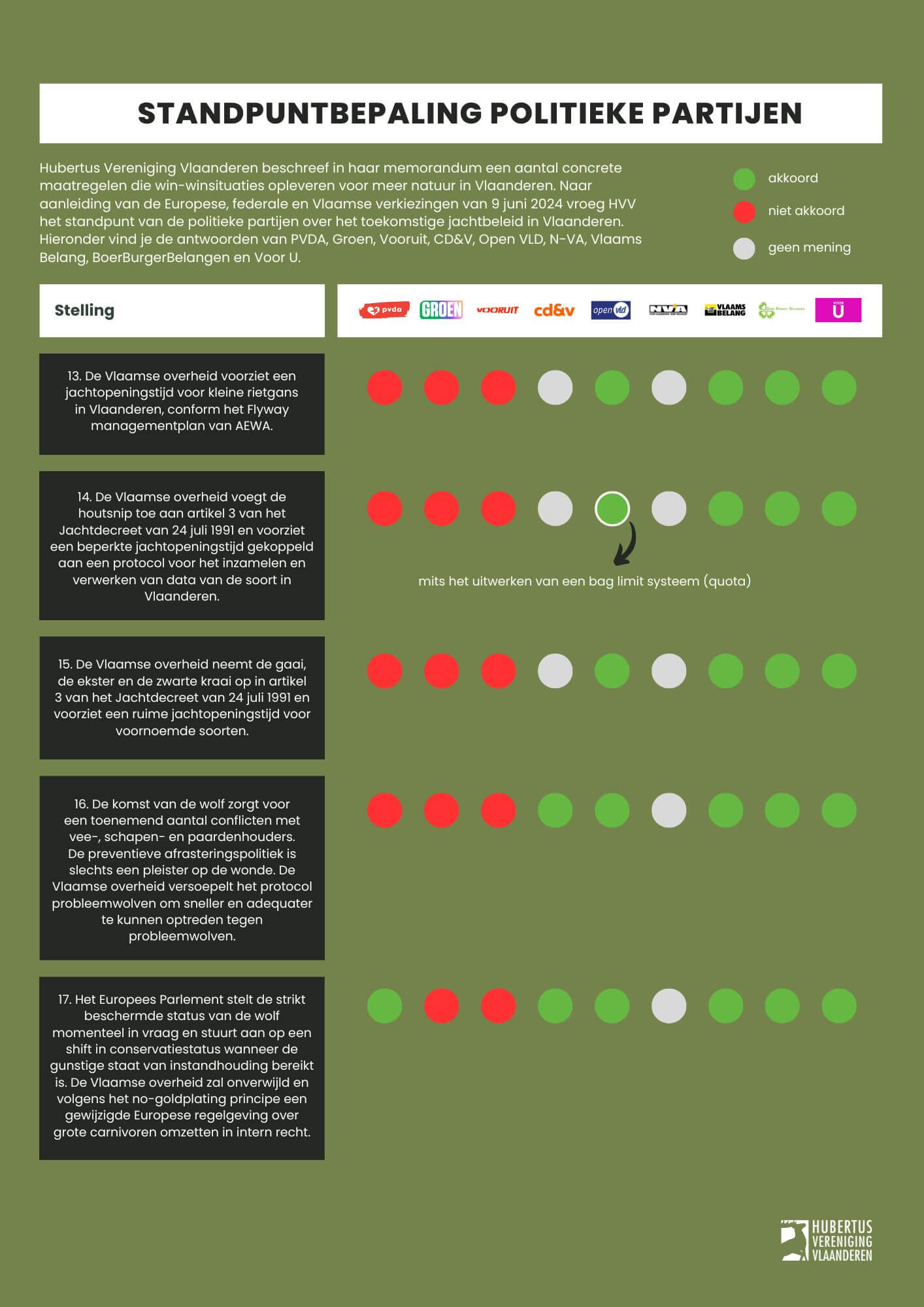 Naar aanleiding van de Europese, federale en Vlaamse verkiezingen van 9 juni 2024 vroeg Hubertus Vereniging Vlaanderen het standpunt van de belangrijkste politieke partijen over het toekomstige jachtbeleid in Vlaanderen
