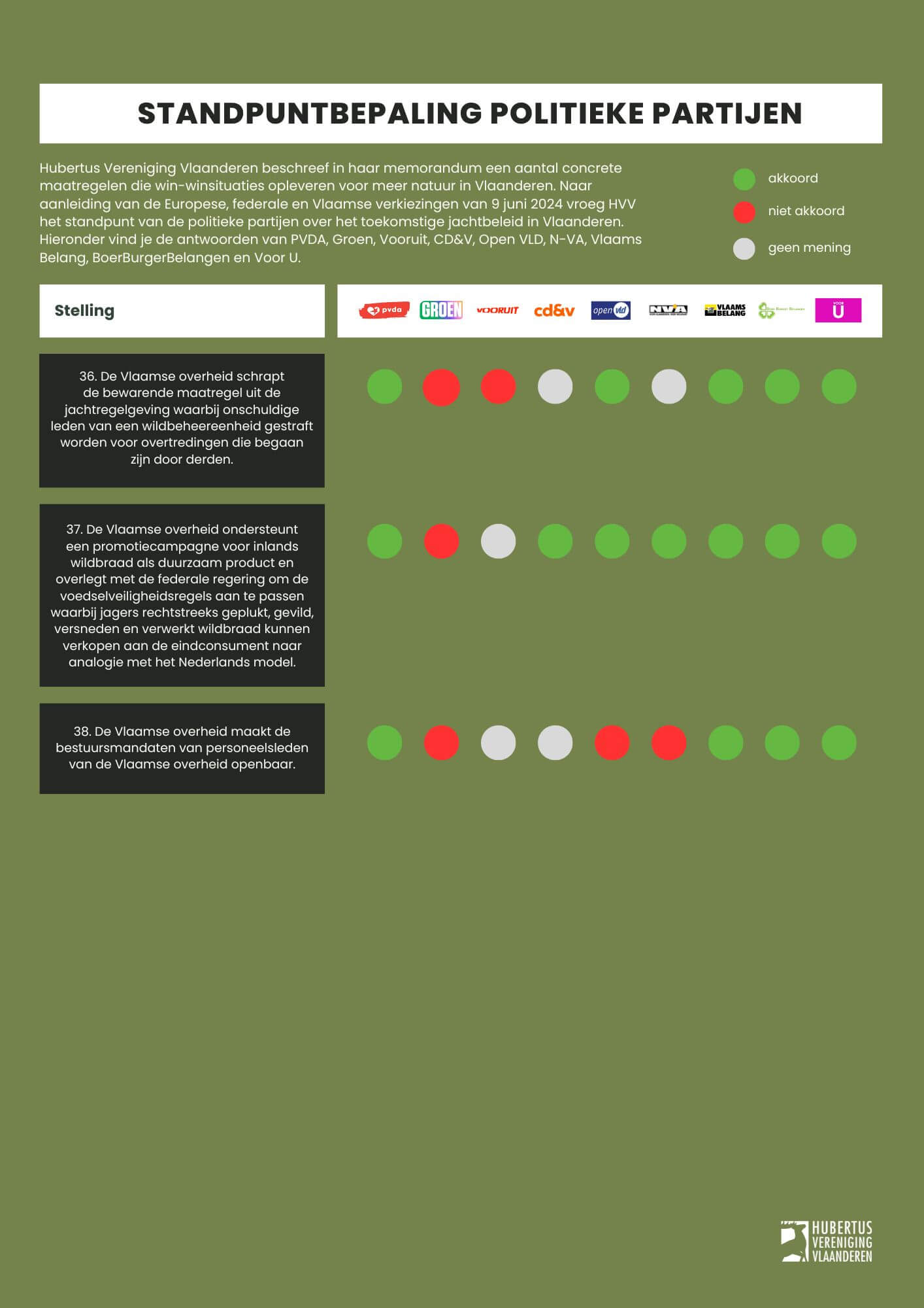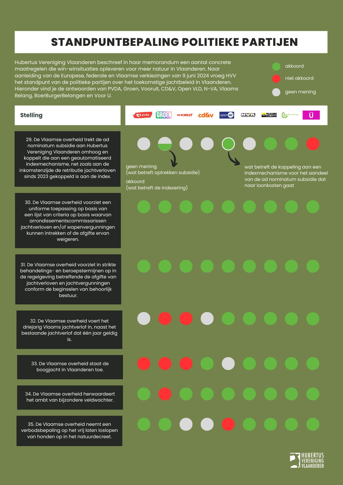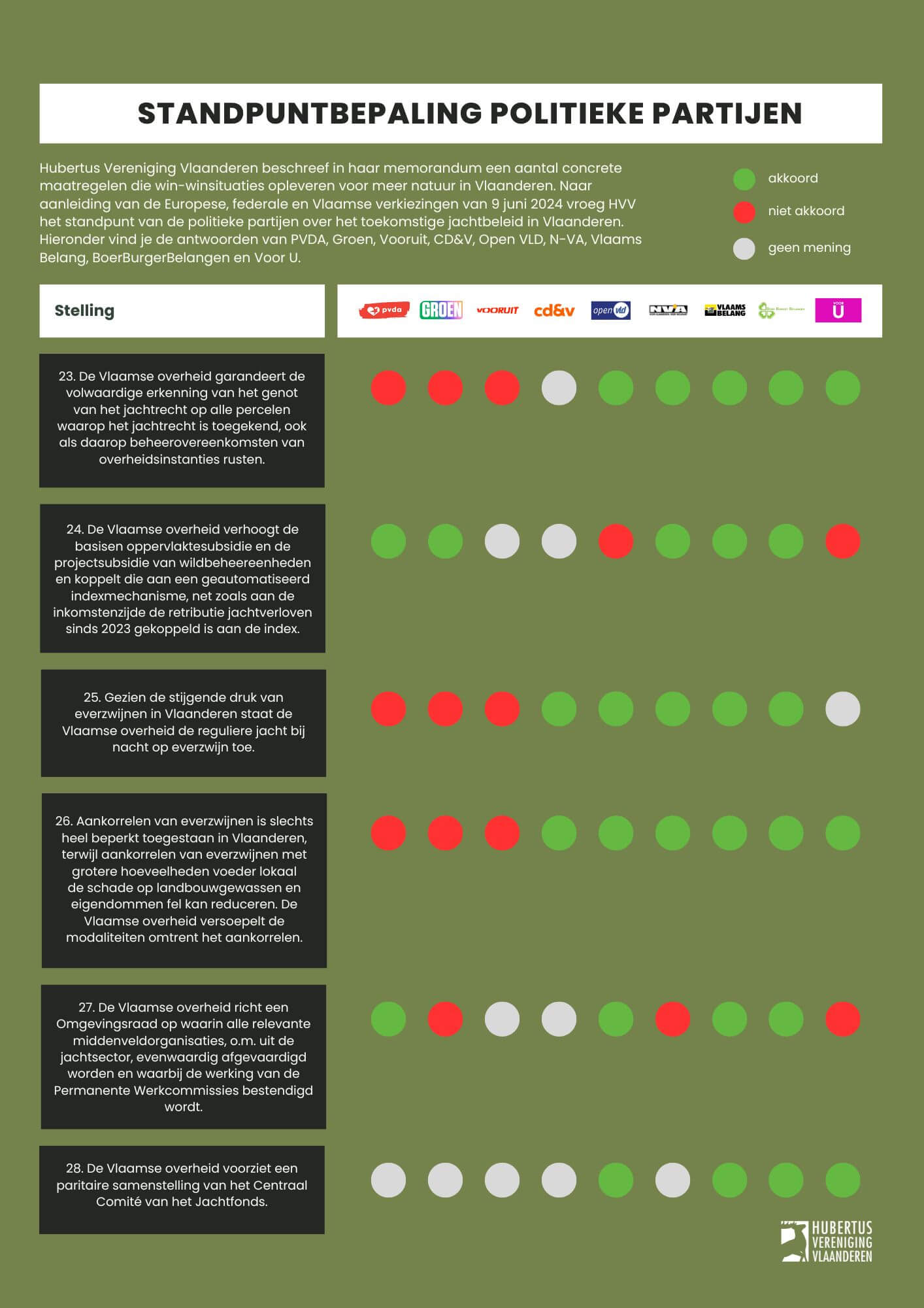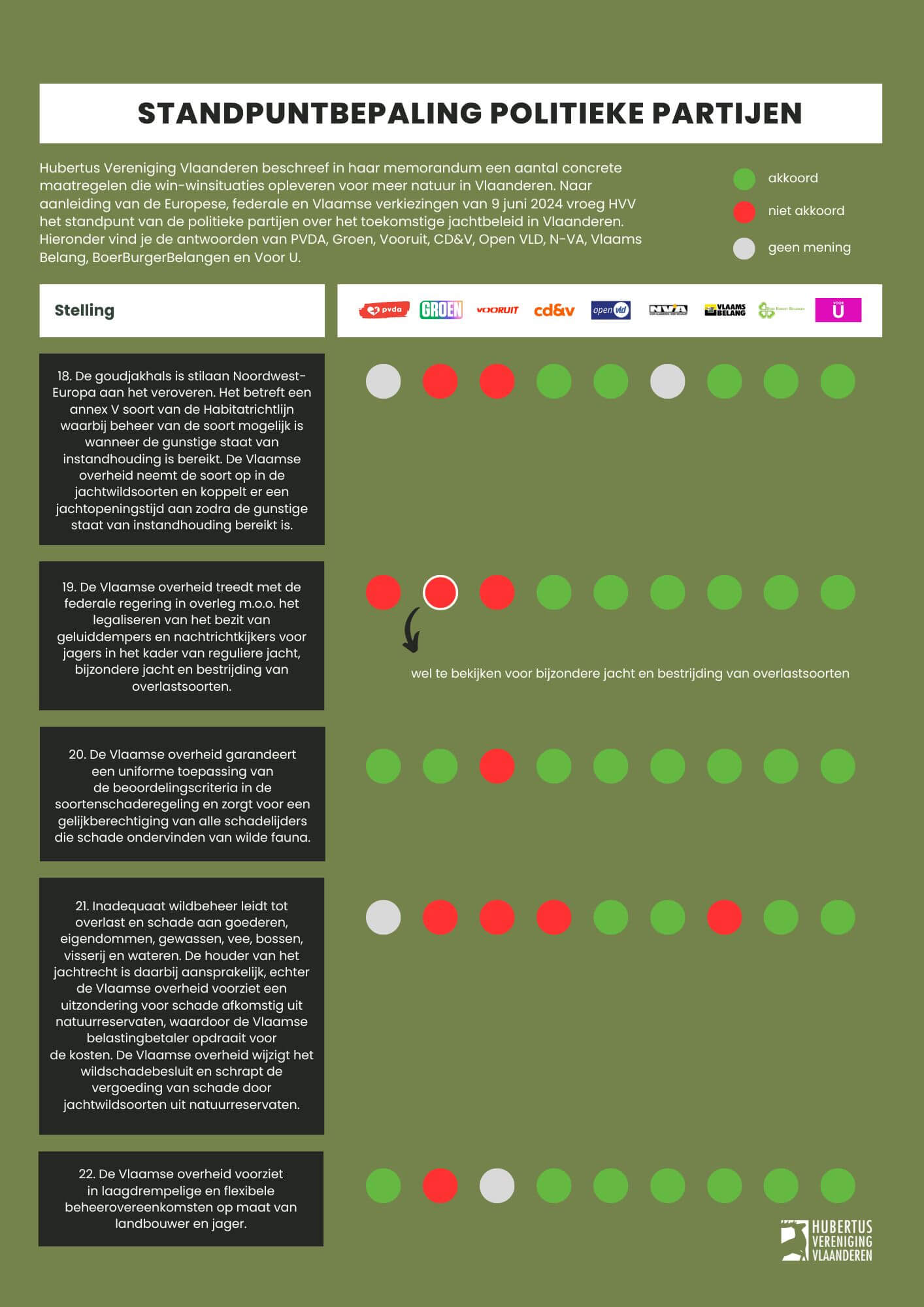Naar aanleiding van de Europese, federale en Vlaamse verkiezingen van 9 juni 2024 vroeg Hubertus Vereniging Vlaanderen het standpunt van de belangrijkste politieke partijen over het toekomstige jachtbeleid in Vlaanderen