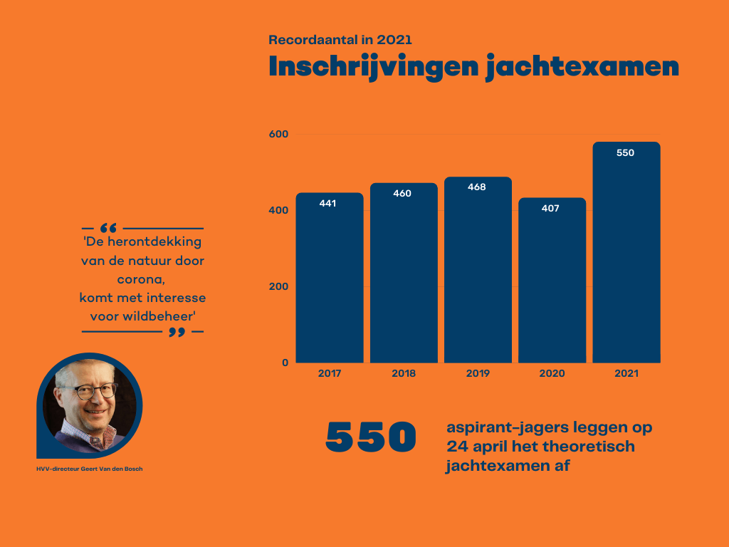 Voor dat examen schreven zich dit jaar 550 kandidaten in. Bijna een kwart meer dan vijf jaar geleden, en meteen ook het hoogste aantal sindsdien. Geert Van den Bosch, directeur van Hubertus Vereniging Vlaanderen, spreekt van een ‘bemoedigend record’.