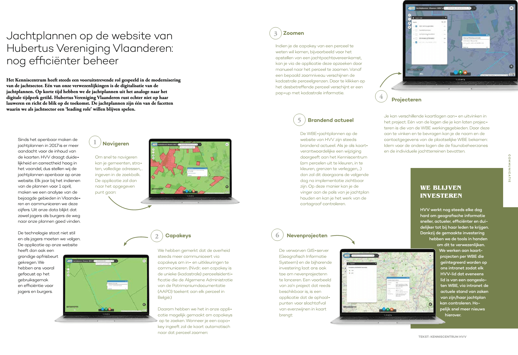Van den Bosch wijst naar de laatste update van de jachtplannen, elk jaar gepubliceerd door Hubertus Vereniging Vlaanderen. Een jachtplan –een soort online stafkaart van de omgeving– markeert het gebied waar een jager rechtmatig aan wildbeheer mag doen, en tot waar de grenzen lopen van zijn beheeractiviteiten.