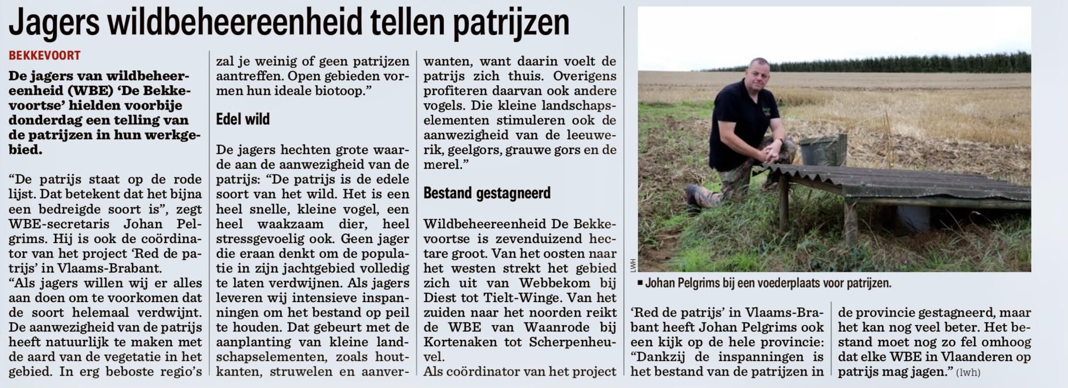 Ook niet onbelangrijk in dat kader, aldus de directeur van Hubertus Vereniging Vlaanderen: ‘Als de jagerij zijn inspanningen vermindert, dan moet de overheid bijspringen, terwijl die al kampt met een gebrek aan middelen en mankracht, en natuurverenigingen staan eerder voor een globale aanpak qua biotoopverbetering, in plaats van een gerichte aanpak voor de patrijs.’