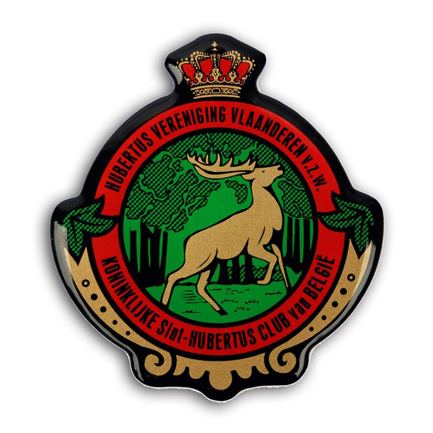 Vierkleurige sticker met opschrift “Hubertus Vereniging Vlaanderen – Koninklijke Sint-Hubertus Club van België”.